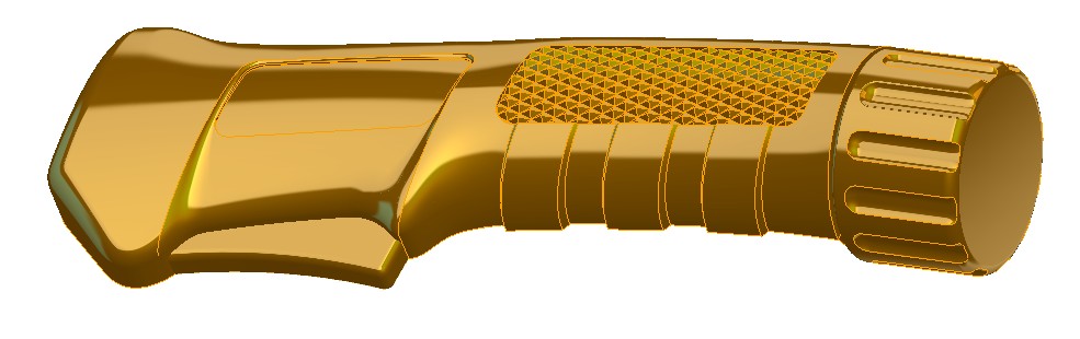 Knurled pattern mapped to curved surface of handle. Final model defines and associates the child parts driving their forms including; both halves of the handle, trigger, and knob.
